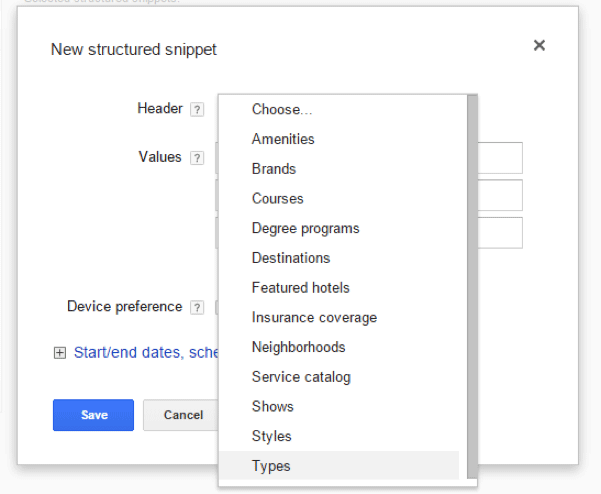The structured snippet extension has predefined headers which an advertiser can select from: